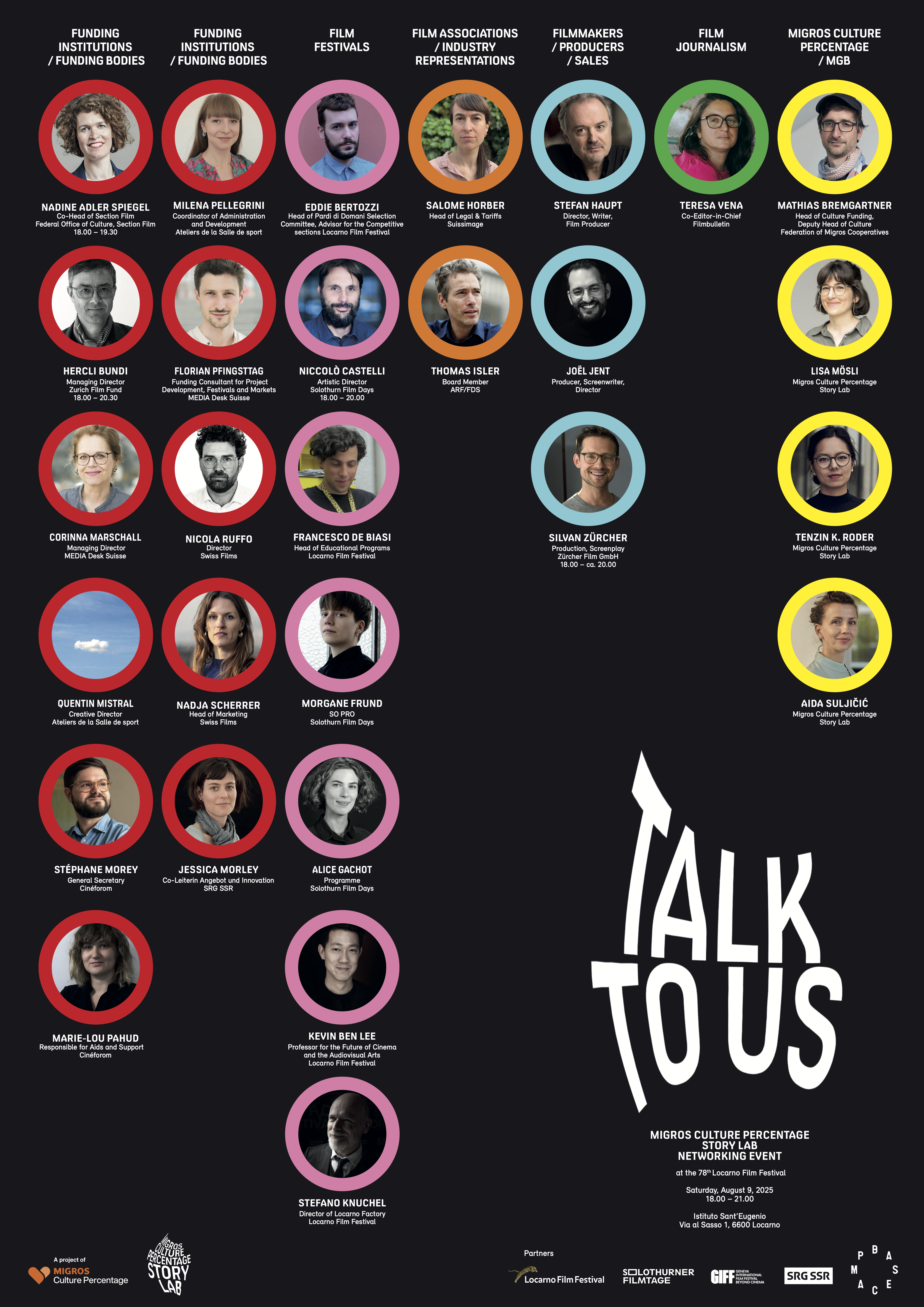 Let’s talk! Avviare semplicemente una conversazione: questo era il nostro obiettivo per l’evento di networking dello Story Lab di quest’anno a Locarno. L’idea era quella di rompere gli schemi consolidati e favorire nuovi incontri. La prossima generazione di cineasti deve affrontare molti ostacoli, quindi è ancora più importante coltivare lo scambio per andare avanti insieme. A tal fine abbiamo invitato diversi attori del settore cinematografico che apportano una vasta esperienza e competenza. Il nostro grande obiettivo: mettere le persone in contatto tra loro e creare così nuovi momenti di networking. È stato un successo! Giovani talenti ed esperti del settore hanno avuto modo di scambiarsi opinioni durante un aperitivo vegetariano/vegano accompagnato da bevande fresche: in modo semplice, aperto, alla pari. Che gioia che abbia funzionato! Ringraziamo i numerosi partecipanti e siamo curiosi di vedere quali progetti nasceranno da questi nuovi incontri.